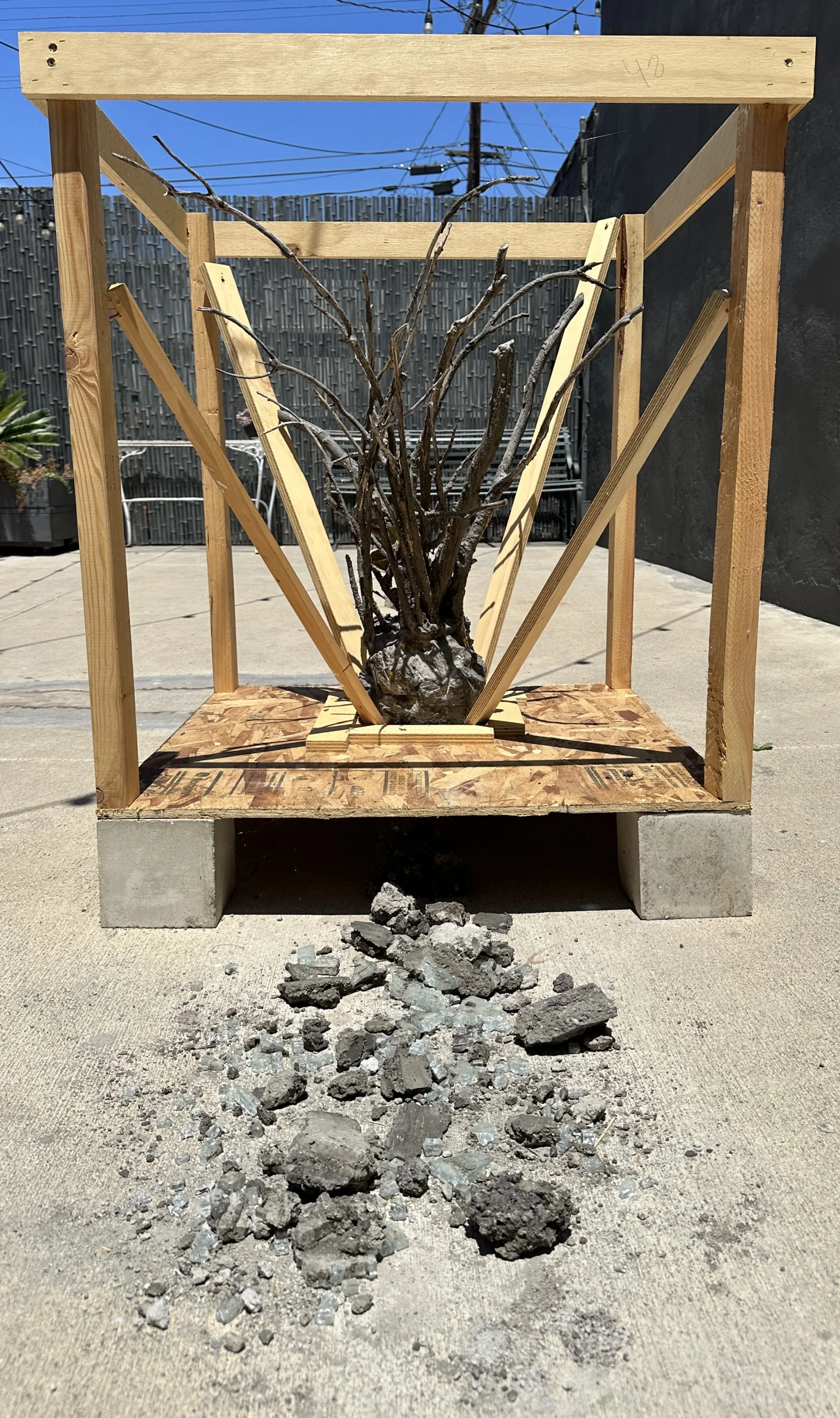 There Once Was A Tree continues my exploration of mythology and mythmaking, our inescapable human need for sense-making and meaning-making, exploring the process by which we create our own myths, how we distort nature into another form and imbue it with meaning and purpose; how we mold, break, bond and reshape our experiences into a new narrative, a new myth which continues its cycle of framing how we perceive the world. The materials and process reflect this: the gathering of branches from a dead tree, casting it in cement in a glass container, breaking the glass and using the shards within the piece itself, chiseling the concrete and pouring more concrete over—reshaping, remolding, creating a new form from what was once a tree.